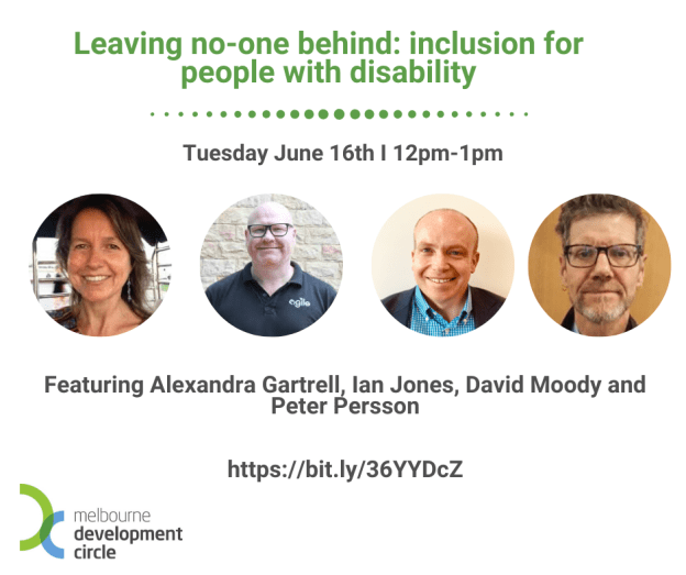 On June 16 this year, Melbourne Development Circle continued their Game Changer series for 2020 looking at the inclusion of people with disability. Our expert panellists explored the changing landscape, systems and innovations, in Australia and internationally, that have supported inclusion for people with disability. Times of crises, such as recent bushfires and the current global COVID-19 pandemic, have resulted in rapid changes, leaving our systems strained, diverted and tested. They also shared about their experience with different structures (e.g. NDIS) and interventions to facilitate inclusion.